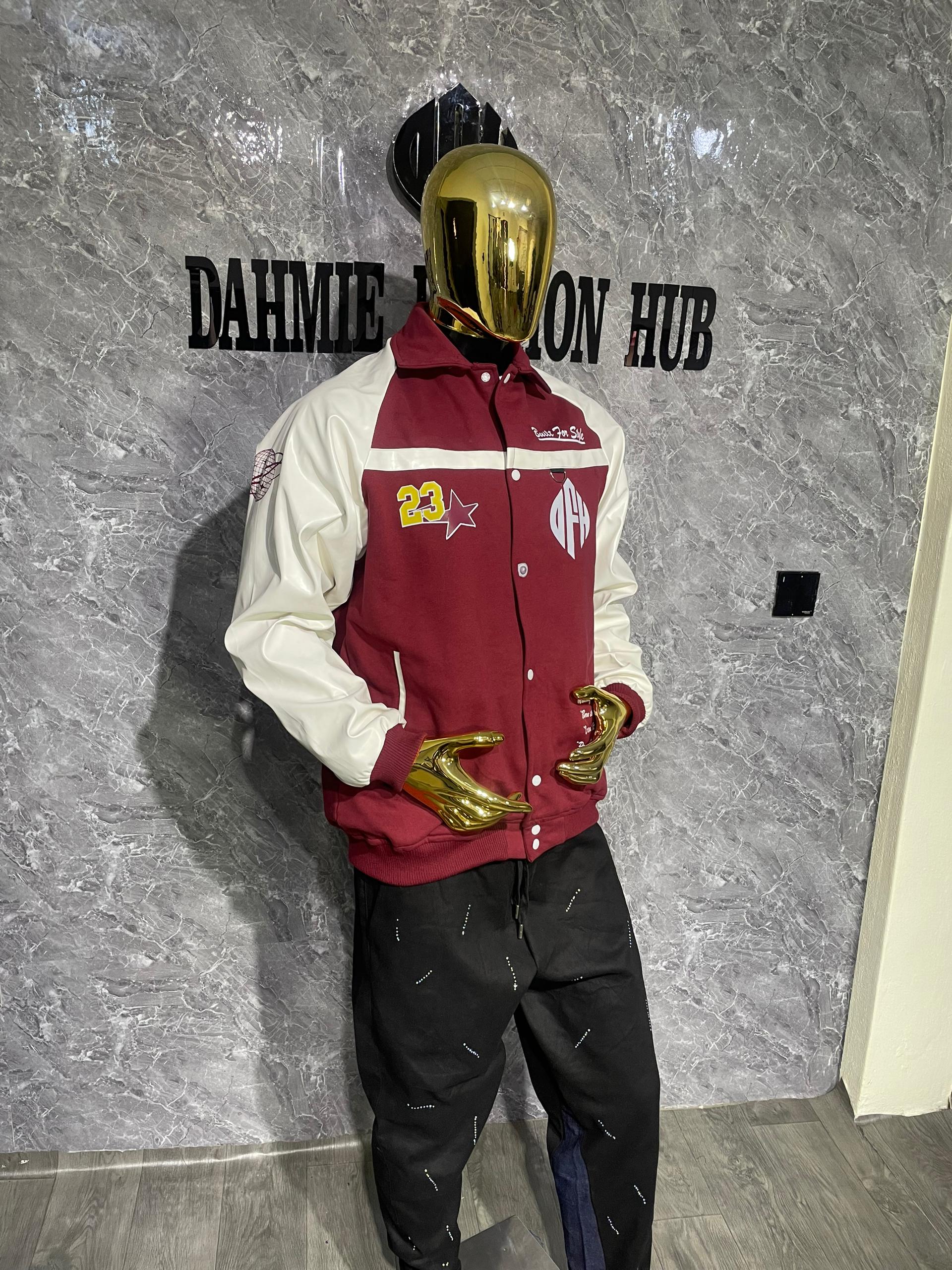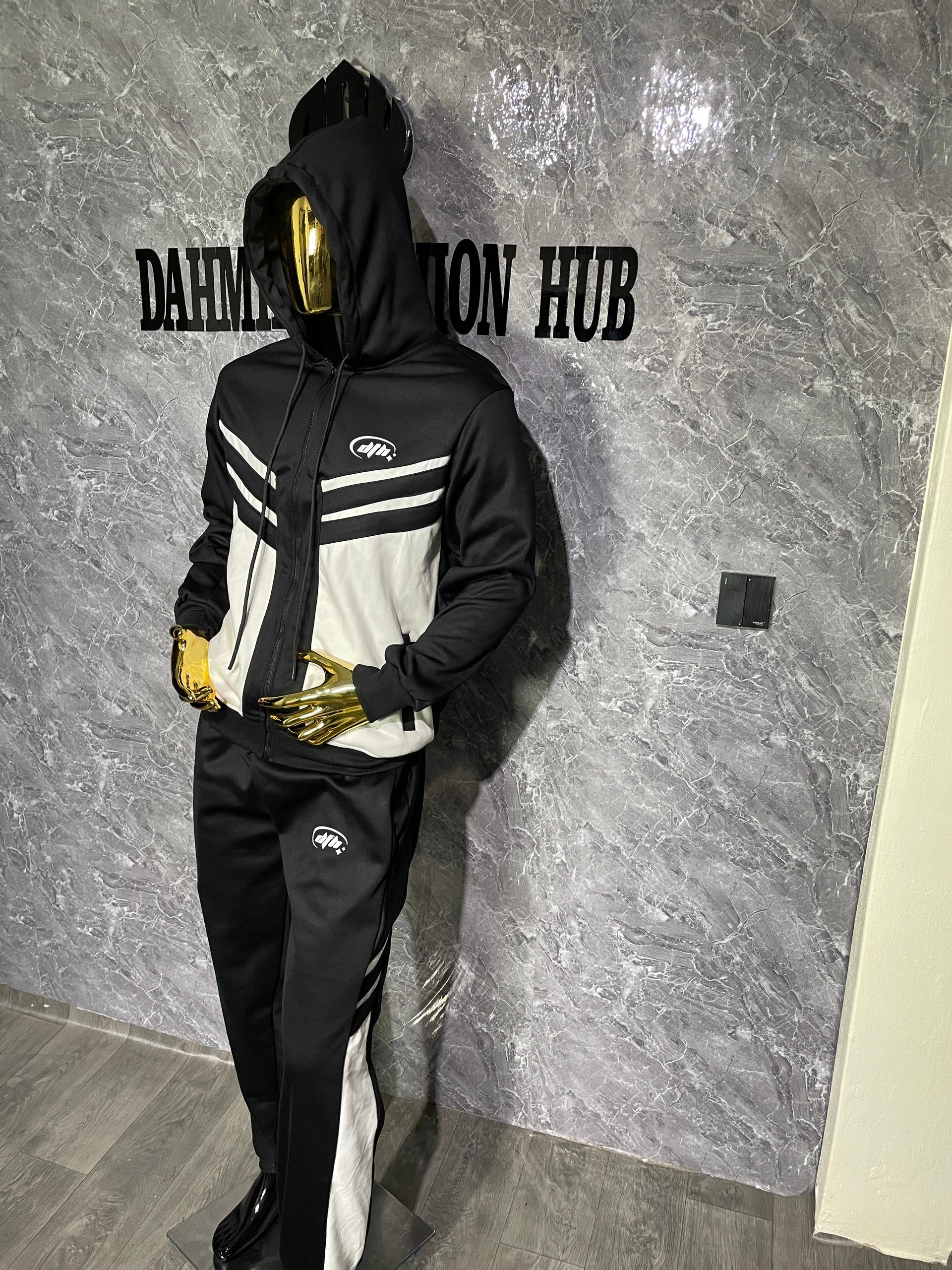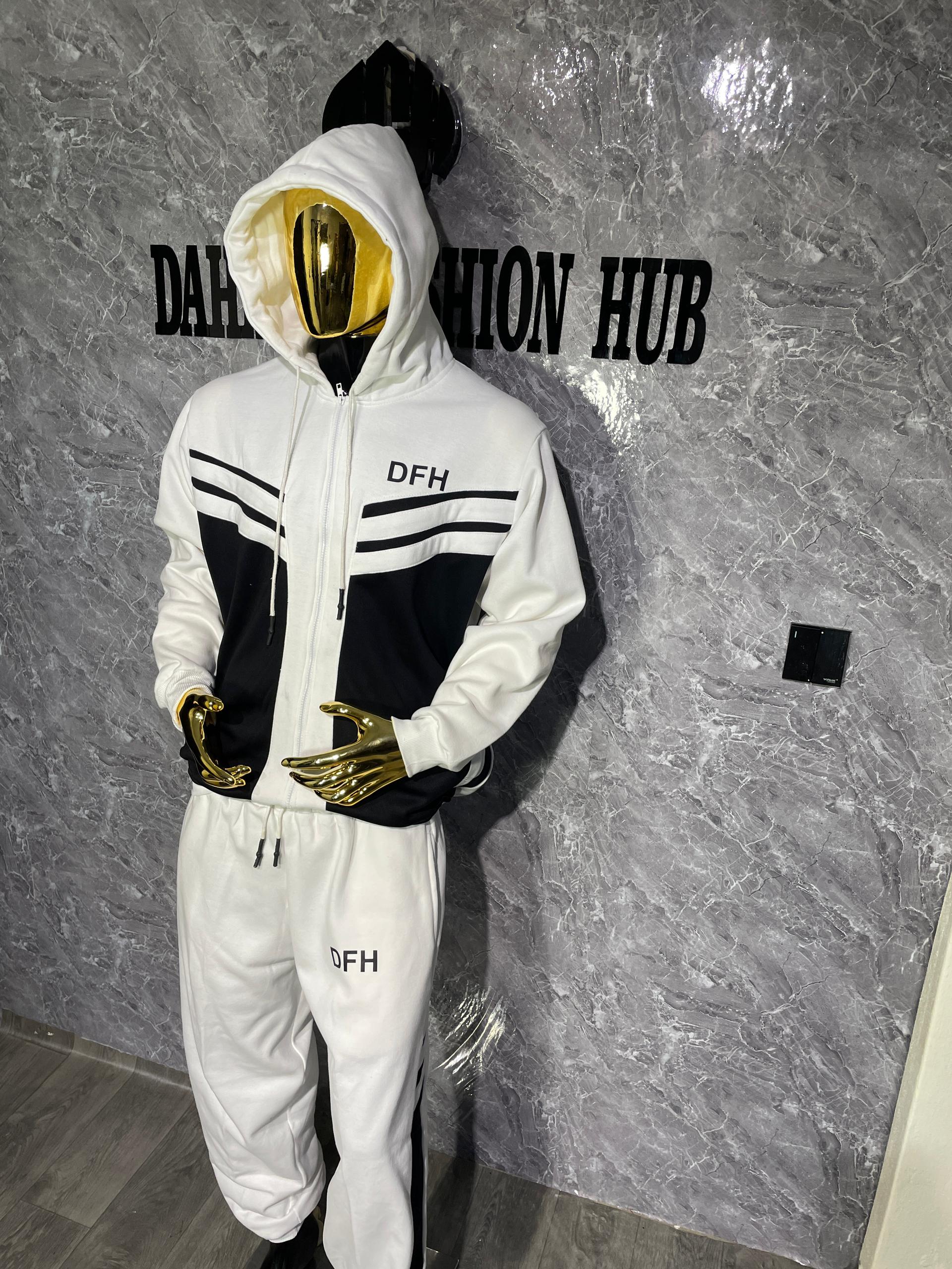 This premium two-piece set features a full-zip hooded jacket paired with matching joggers, crafted in a clean ivory base with sharp black panel detailing. The signature DFH logo is subtly placed on both the jacket and joggers, giving it a refined, high-end finish.